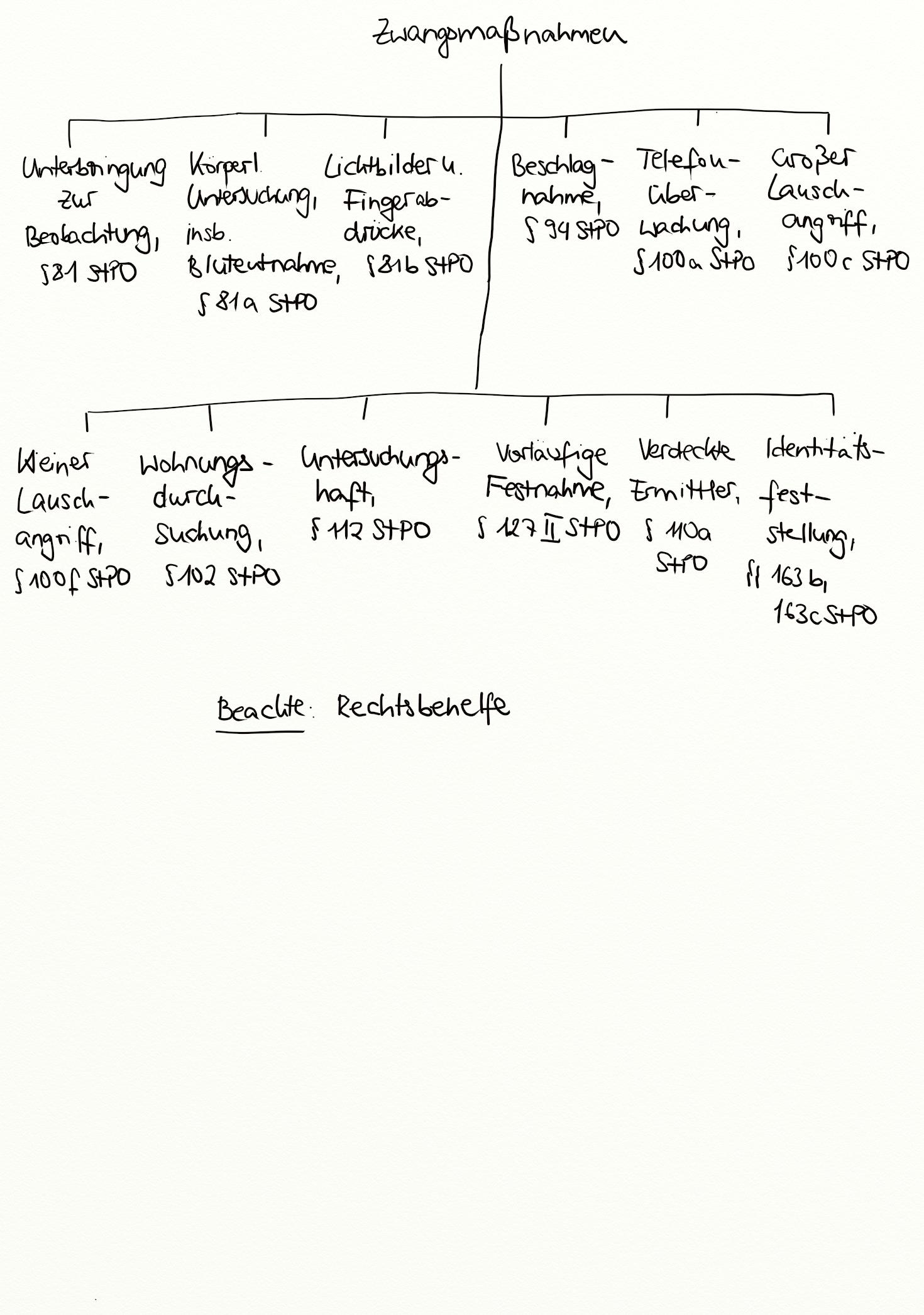 § 127 StPO, Beschlagnahme, § 94 StPO, § 112 StPO, § 81 StPO, Blutentnahme, § 81a StPO, § 100a StPO, Telefonüberwachung, § 100c StPO, Großer Lauschangriff, § 100f StPO, § 127 II StPO, Kleiner Lauschangriff, § 102 StPO, Untersuchungshaft, Wohnungsdurchsuchung, Verdeckter Ermittler, Zwangsmaßnahmen, Vorläufige Festnahme, Identitätsfeststellung, § 110a StPO, § 163c StPO, § 163b StPO