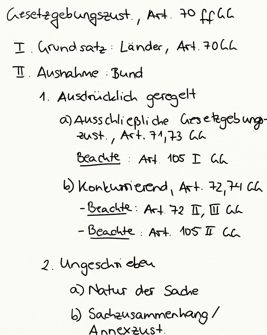 Gesetzgebung, Gesetzgebungskompetenz, Ausschließliche Gesetzgebungszuständigkeit, Konkurrierende Gesetzgebungszuständigkeit, Gesetzgebungszuständigkeit, formelle Verfassungsmäßigkeit, Art. 105 II GG, Annexzuständigkeit, Art. 70 GG, Art. 71 GG, Art. 74 GG, Art. 73 GG, Art. 105 I GG, Art. 105 GG, Art. 72 I GG, Art. 72 GG, Art. 72 III GG, Art. 72 II GG