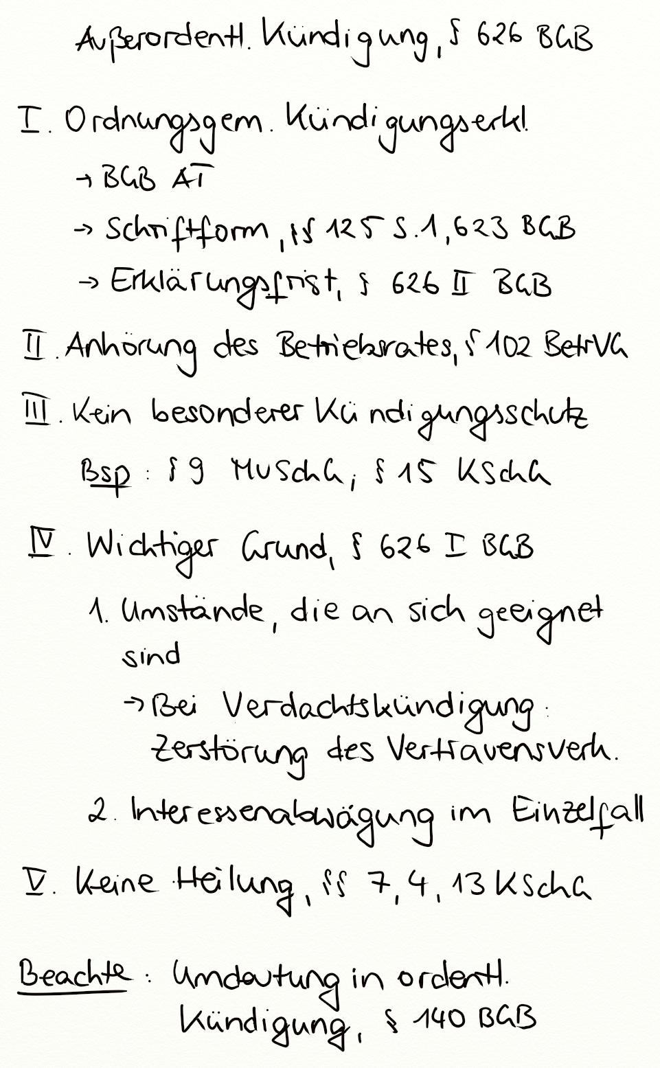 § 125 BGB, § 15 KSchG, § 140 BGB, Betriebsrat, § 13 KSchG, Verdachtskündigung, Besonderer Kündigungsschutz, Kündigungsgrund, § 102 BetrVG, § 626 I BGB, § 626 II BGB, § 626 BGB, Schriftform, Kündigungsschutzklage, § 4 KSchG, § 7 KSchG, Außerordentliche Kündigung, § 125 S. 1 BGB, Kündigung, Umdeutung, Betriebsratstätigkeit, Kündigungsschutz, § 9 MuSchG