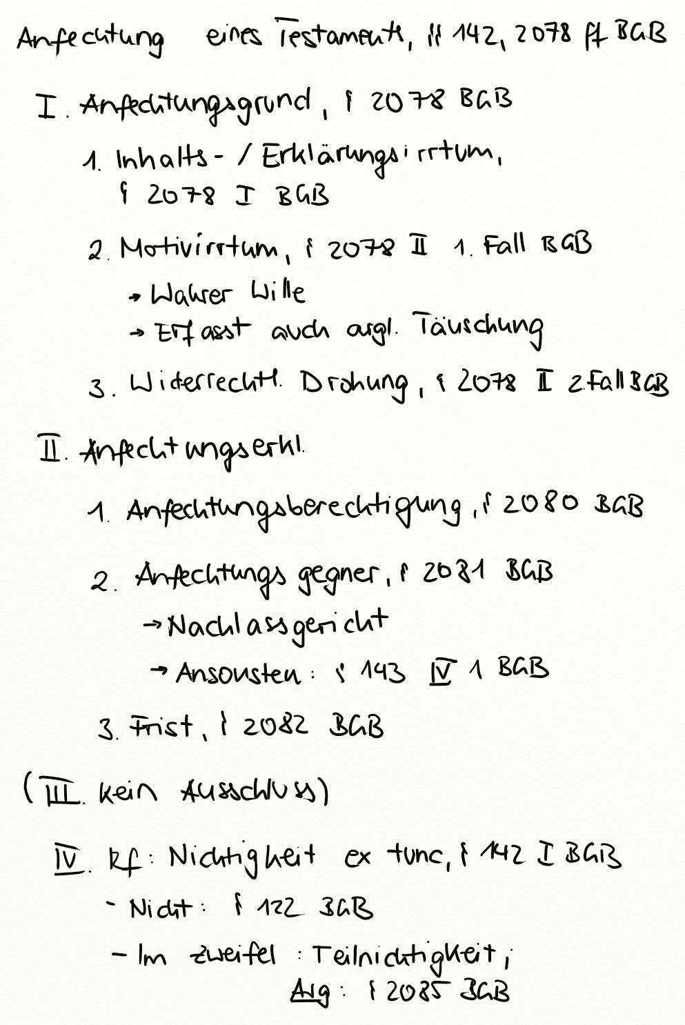§ 142 I BGB, Anfechtung eines Testaments, § 2078 I BGB, § 2078 II BGB, § 2078 BGB, Anfechtungsfrist, Testament, § 2082 BGB, § 143 IV BGB, § 2085 BGB, § 2080 BGB, Anfechtungsberechtigung, Nachlassgericht, § 2081 BGB, Anfechtungserklärung, ex tunc, Anfechtungsgrund, § 142 BGB, Motivirrtum, Arglistige Täuschung, Drohung, Erklärungsirrtum, Inhaltsirrtum, Anfechtungsgegner, Anfechtung, § 143 BGB