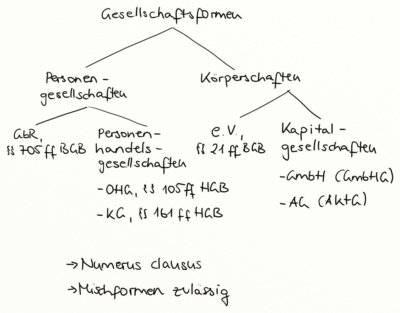Gesellschaft bürgerlichen Rechts, Personengesellschaft, Kapitalgesellschaft, Aktiengesellschaft, Gesellschaft mit beschränkter Haftung, § 705 BGB, Personenhandelsgesellschaft, Offene Handelsgesellschaft, Kommanditgesellschaft, § 161 HGB, eingetragener Verein, § 21 BGB, Körperschaft, Gesellschaftsformen, juristische Personen
