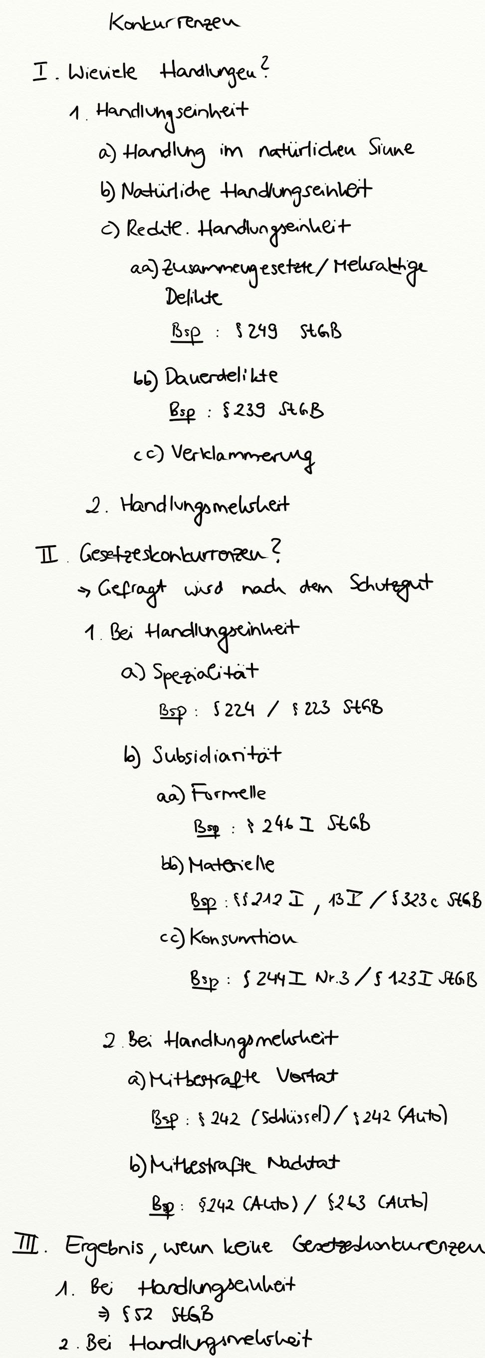 § 52 StGB, § 53 StGB, Handlungseinheit, Handlungsmehrheit, Konkurrenzen, Verklammerung, Spezialität, Subsidiarität, Handlung im natürlichen Sinne, natürliche Handlungseinheit, Mehraktige Delikte, Gesetzeskonkurrenz, Formelle Subsidiarität, Materielle Subsidiarität, Mitbestrafte Vortat, Mitbestrafte Nachtat, Dauerdelikt, Konsumtion