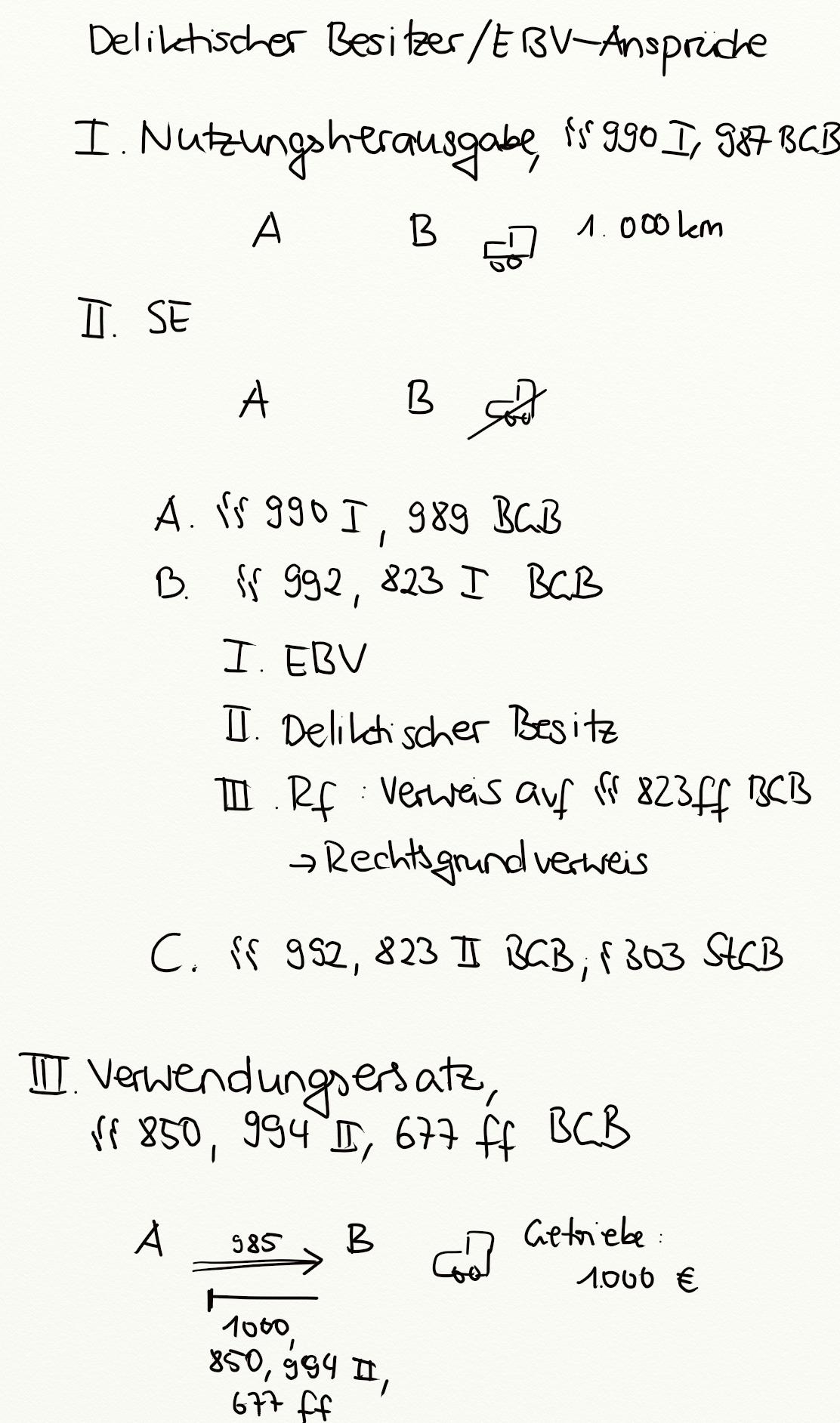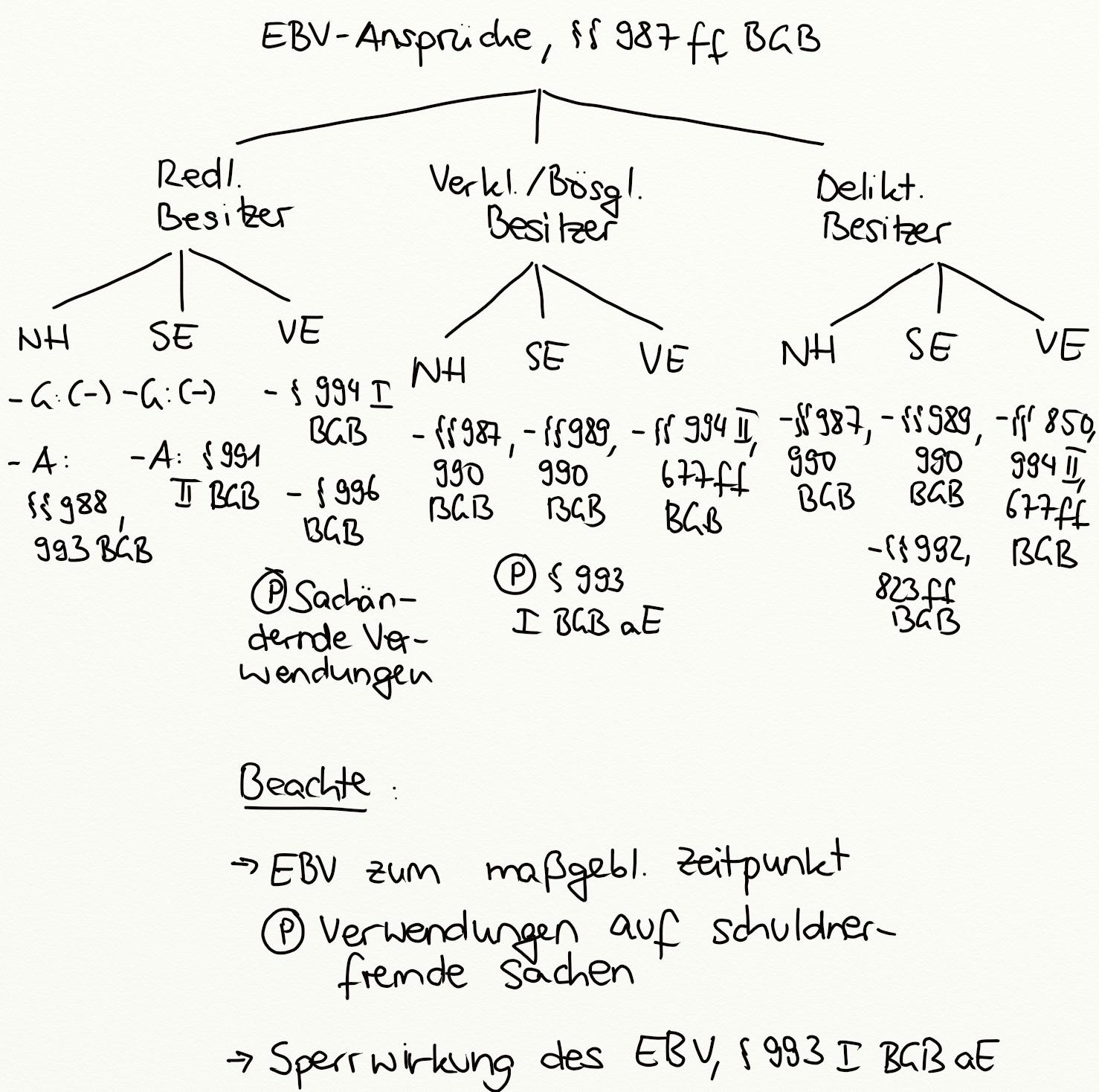 Nutzungsherausgabe, Eigentümer-Besitzer-Verhältnis, Schadensersatz, EBV, Redlicher Besitzer, bösgläubiger Besitzer, Verklagter Besitzer, Verwendungsersatz, § 987 BGB, Sperrwirkung des EBV, § 993 BGB, Deliktischer Besitzer, § 850 BGB, § 994 II BGB, § 993 I BGB, § 991 II BGB, § 990 I BGB, § 994 I BGB, § 991 BGB, § 989 BGB, § 988 BGB, § 990 BGB, Sachändernde Verwendungen, § 996 BGB, § 994 BGB