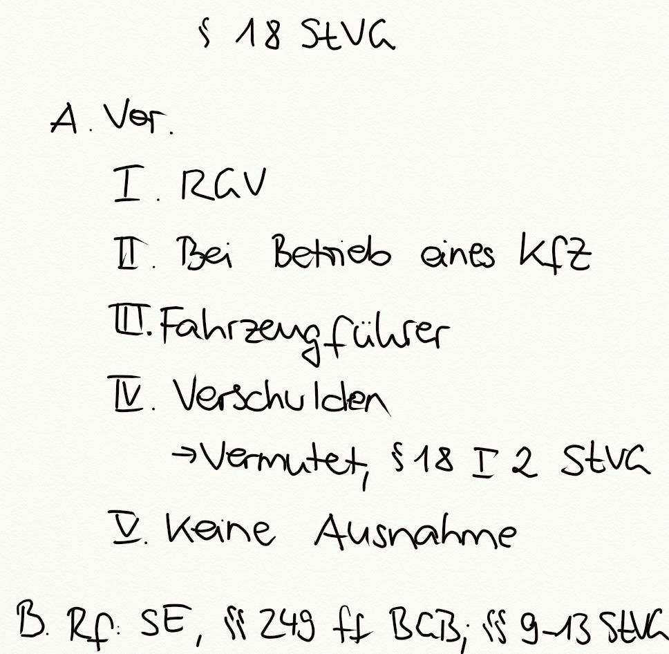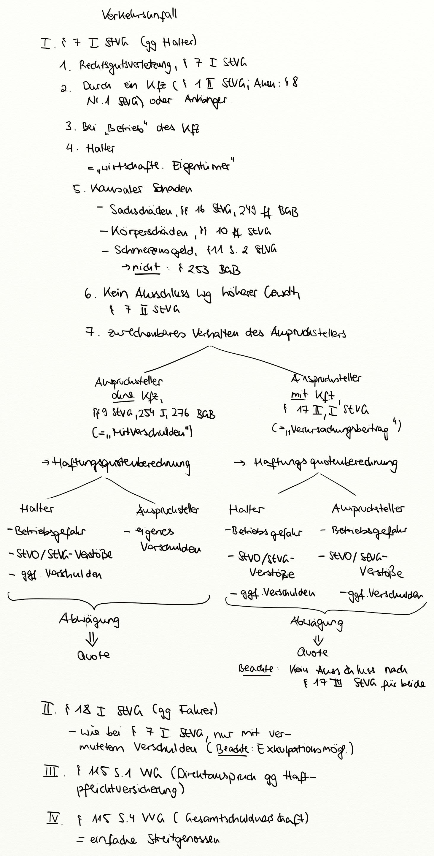 § 10 StVG, § 16 StVG, § 11 S. 2 STVG, § 11 StVG, § 17 StVG, Schmerzensgeld, vermutetes Verschulden, § 17 I StVG, § 17 II StVG, § 1 StVG, Verkehrsunfall, § 8 Nr. 1 StVG, § 1 II StVG, Betriebsgefahr, § 7 I StVG, § 18 I StVG, § 115 VVG, § 115 S. 1 VVG, Direktanspruch, Haftpflichtversicherung, § 9 StVG, § 115 S. 4 VVG, § 8 StVG, Exkulpation, § 18 StVG, Fahrzeugführer, Fahrzeughalter, § 7 StVG, KfZ, Gesamtschuld, Bei Betrieb