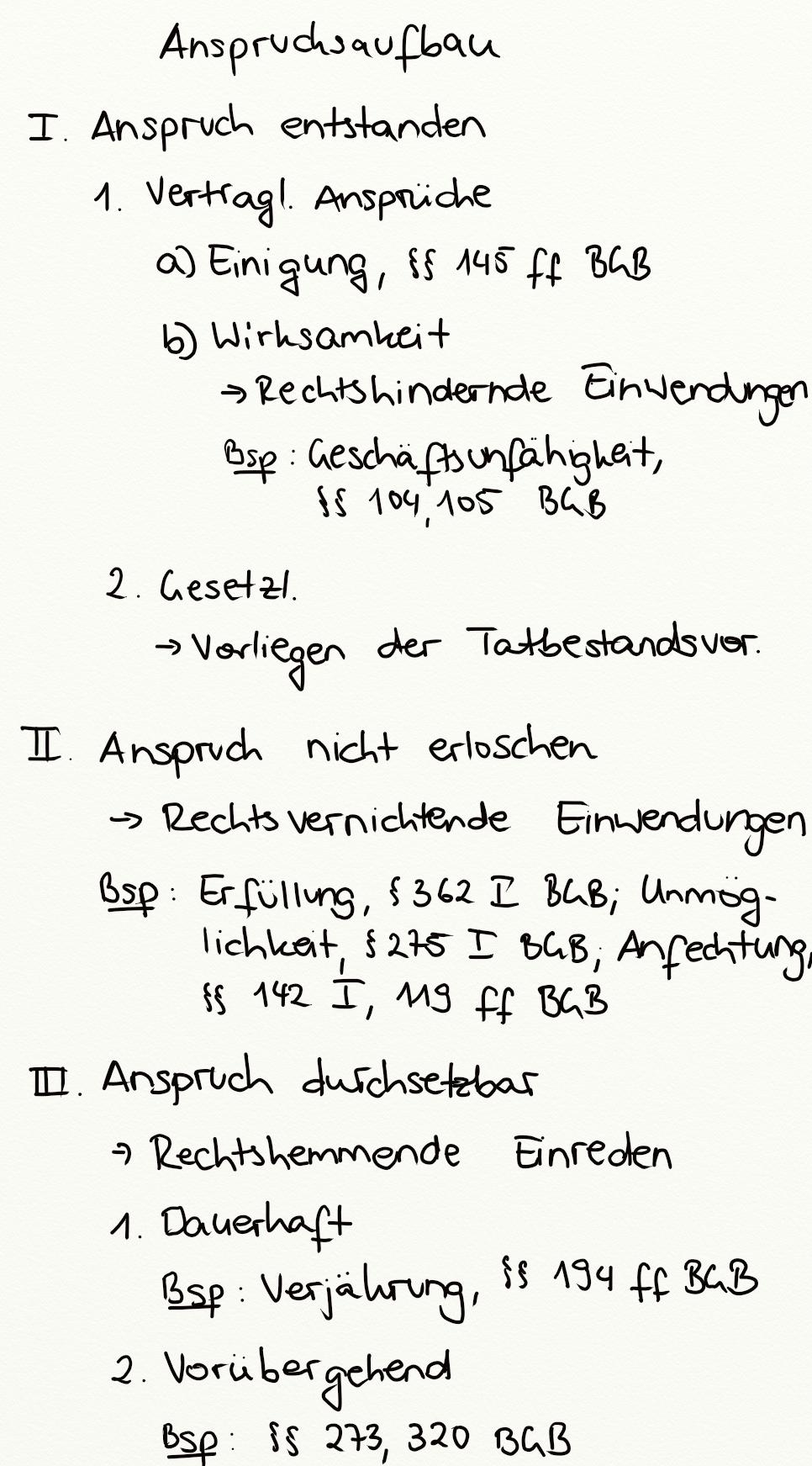 Anspruchsaufbau, Anspruch entstanden, Anspruch durchsetzbar, Einwendung, Einrede, Anspruch erloschen, Verjährung, Einigung, § 362 I BGB, § 273 BGB, § 320 BGB, Rechtshemmende Einrede, Zurückbehaltungsrecht, Rechtsvernichtende Einwendung, Erfüllung, § 104 BGB, § 105 BGB, Einrede des nicht erfüllten Vertrages, Entstehung eines Anspruchs, Erlöschen eines Anspruchs, Geschäftsunfähigkeit, Rechtshindernde Einwendung, Anfechtung, § 275 I BGB, Unmöglichkeit, Wirksamkeit einer Einigung, § 142 I BGB, § 194 BGB, Durchsetzbarkeit eines Anspruchs, § 145 BGB, § 275 BGB, § 142 BGB, § 362 BGB, § 119 BGB